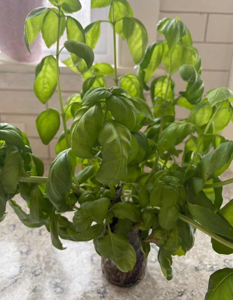 *An easy way to have fresh basil for pesto all year round is to buy a small plant in the produce section, set it in water, and let it grow a bit so you can use the leaves for your pesto. Never let the plant or any basil go to seed. It will produce a bitter flavor.