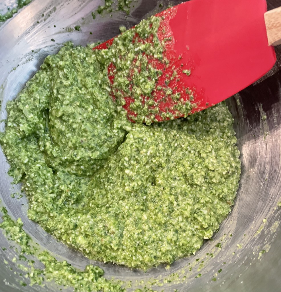 Directions: As a quick reminder, the pesto will come out as a paste, but after cooking pasta, use the pasta water to thin out the pesto. It is not meant to be heated over the stove, as it will turn black.