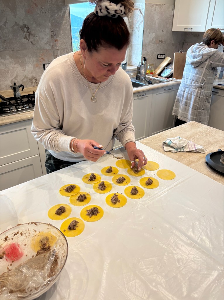 In Francesca’s beautiful kitchen in Artena, Alessandro and I shaped ox cheek tortelloni by hand, sealing each one before it joined the pot for Sunday dinner. In the background, Lucia worked steadily on the rest of the meal as the kitchen filled with conversation and anticipation. Later, we gathered to enjoy what we had all helped prepare — a reminder that the best meals are the ones made together.